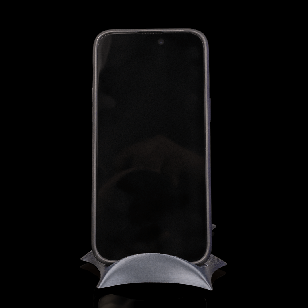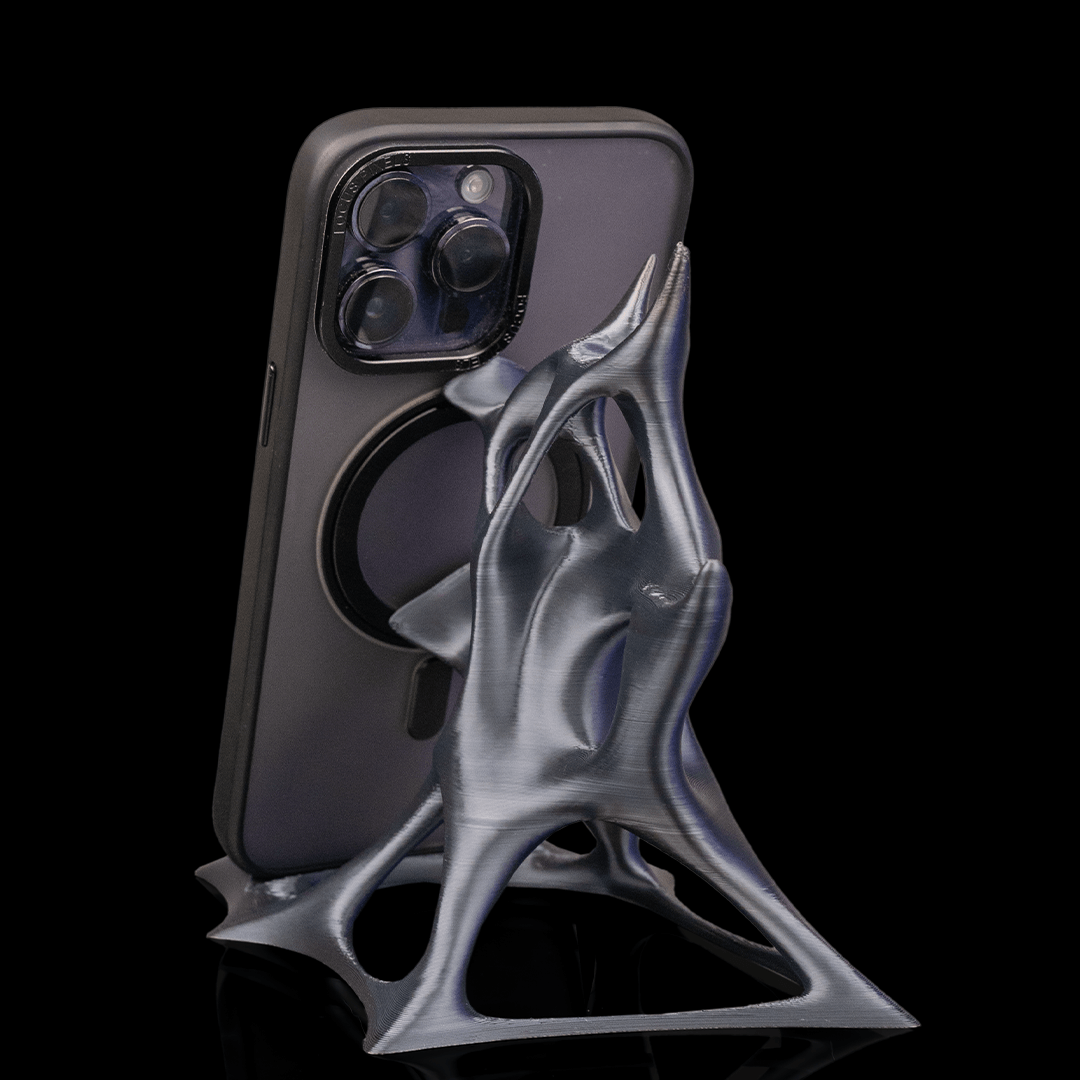 Transforme sua mesa em um ambiente mais sofisticado e funcional com este suporte abstrato para celular. Seu design é composto por formas fluidas e orgânicas que envolvem o aparelho de maneira natural, criando uma peça que vai além da utilidade e se destaca como elemento decorativo.